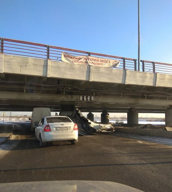 Il ponte stesso è degno di nota: è molto basso e quindi sotto è impossibile guidare il trasporto merci, il che avverte cartello stradale che indica un’altezza di 2 metri. Tuttavia, questo è in qualche modo non ferma i conducenti di veicoli pesanti. E quindi presto accanto al cartello stradale di avvertimento appariva un enorme un segno che è semplicemente impossibile non notare – “Pericolo! Basso il ponte! La gazzella non passerà. “Nonostante ciò, dall’inizio dell’autunno qui almeno quindici gazzelle si sono già schiantate e un’altra L’incidente è avvenuto solo l’altro giorno (vedi foto).