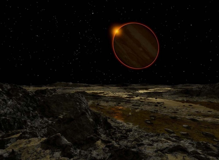 Giove è lontano dal Sole, più di cinque volte più lontano che dal luminare è la Terra. Guarda come gi� il disco solare sul satellite di Giove – l’Europa sembra essere una nana.