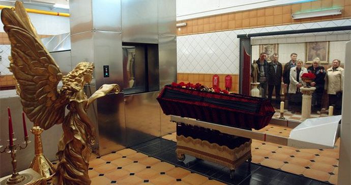 Nel 1996, durante un po ‘di permissività nel paese, La televisione di Pietroburgo ha mostrato un rapporto diretto dal crematorio. Il momento clou di questo spettacolo, che pochi hanno visto (è passato nel pomeriggio e mai più ripetuto), divenne quello alla testa del defunto sensori elettroencefalografici collegati per esaminare attività cerebrale nel momento in cui il cadavere viene inviato al forno.