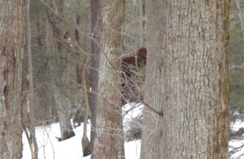 La foto scattata da un uomo mostra una foresta innevata. dritto tra i due alberi sullo sfondo è visibile in alto figura a forma di scimmia con capelli rossastri. Gli scettici ne sono sicuri questo è un normale moncone muschioso, ma il testimone afferma che la creatura camminò rapidamente attraverso i boschi e scricchiolò rumorosamente di neve, che cos’è un moncone?