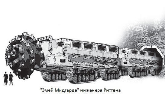Più fortunato fu il destino dell’ingegnere progettista Ritten. indipendentemente da Verne nel 1934 sviluppò la sua versione della metropolitana, chiamando il suo “Midgard Serpent”, progettando un’auto principalmente per l’assalto Linea Maginot francese. Il progetto di Ritten aveva una portata sorprendente. Il “Serpente” era un intero treno a 500 m dagli scomparti che misura 7 m di lunghezza, 6 m di larghezza e 3,5 m di altezza con una camera da letto per 30 persone, tre officine, una stazione radio, una cucina e un pronto soccorso barca per uscire in superficie.