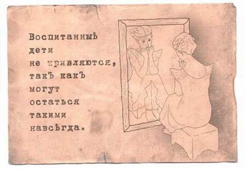 La storia ha ricevuto una certa risonanza e sulla scena del crimine tutti i tipi di curiosi iniziarono ad apparire periodicamente. due gli studenti che hanno registrato la loro sortita sul registratore sono stati trovati in casa abbandonata dedicata a un’antica cartolina del XIX secolo buone maniere. La cartolina raffigurava una ragazza seduta di fronte specchio e mostrando la lingua al suo riflesso. Iscrizione sulla carta Si legge: