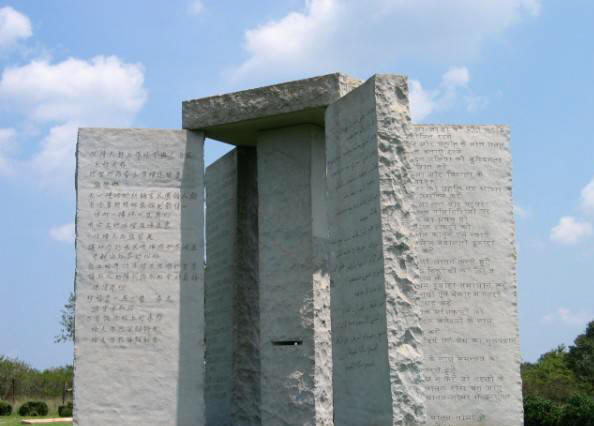 Nel giugno 1979, una persona sconosciuta si nascondeva sotto una beffa pseudonimo di R.S. Christian (R. C. Christian) ordinò la costruzione monumento presso la società “Elberton Granite Finishing Company”. prima dallo stock che recita: “Non lasciare mai la popolazione terrena supera i 500.000.000, in costante equilibrio con natura. “Come stanno andando a fare questo non è riportato.