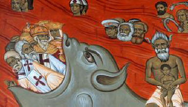 Il nome dell’autore del murale rimane sconosciuto. immagine Il leader comunista jugoslavo Josip Broz Tito con Karl Marx e Friedrich Engels provocarono il muro della chiesa accese discussioni in Montenegro. Su un affresco tutti e tre bruciano nel mare fuoco infernale tra peccatori e bestie diaboliche. La chiesa La resurrezione in cui è stato creato questo murale si trova nella capitale Montenegro Podgorica. È anche criticata per essere eccessivamente pomposa stile architettonico. I critici dicono che la chiesa non dovrebbe interferire in politica.