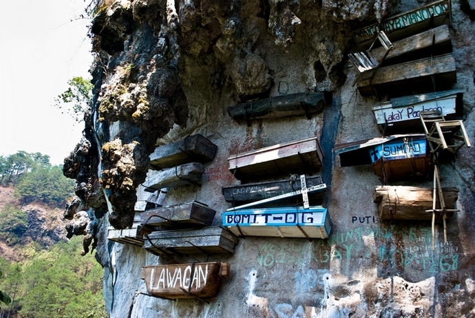 Un cimitero unico chiamato “Le bare sospese della Sagada” Ha una storia di duemila anni. Qui, fin dai tempi antichi, bare sospeso da scogliere calcaree alle corde, e si ritiene più alto è il defunto sospeso, meglio è, perché secondo la credenza popolare I filippini in questo caso, l’anima del defunto è più vicina a Dio, e quindi a lei più facile volare in paradiso.