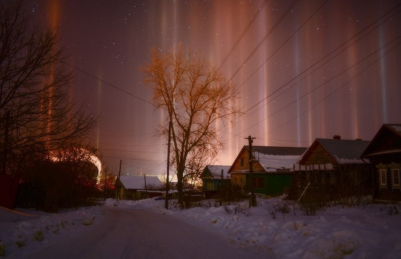 La prima impressione è l’aurora boreale. Tuttavia, da dove viene? a Vyazniki, cioè nella zona centrale della Russia? Quindi immediatamente catturato questo fenomeno nella foto e poi trovato su Internet informazione che questo fenomeno naturale si chiama “luce pilastri “, ed è formato da cristalli di ghiaccio piatti, che si accumulano nell’atmosfera superiore e riflettono la luce il sole. Tuttavia, per la nostra regione è lo stesso: il presente un miracolo!