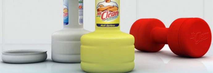 Imballaggio detergente con manubri. ora le casalinghe saranno in grado di costruire muscoli, non solo pulire la cucina piatto.