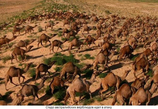 I cammelli, ovviamente, non si riproducono come conigli, eppure il loro numero è cresciuto ogni anno. Presto iniziarono a camminare Branchi di Australia, che non è né in Egitto né negli Emirati Arabi Uniti. Un branco di cammelli – questo è anche quel dono. Dove sono finiti i cammelli – nessuno rimane niente, nemmeno i conigli: calpesteranno tutto e mangeranno tutto. Lattina di cammello 8 giorni da non bere, ma dopo aver raggiunto l’acqua, è in grado di 10 minuti bere fino a 100 litri di liquido. Quindi quando all’oasi in una volta Arrivano 200 cammelli, l’oasi è già stata condannata: prima berranno tutta l’acqua l’ultima goccia e mangia tutte le verdure fino all’ultimo filo d’erba.