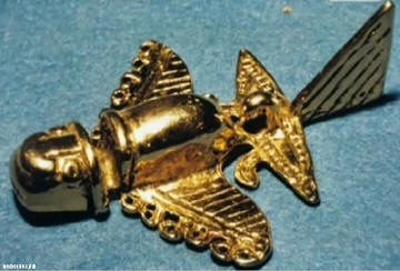 L’oro trovato in Colombia si adatta organicamente a questa teoria. figure di tolim indiani, esternamente molto rievocativi di aeroplani. Gli indiani videro davvero l’aereo e ci provarono ricreare il loro aspetto. Certo, i veri aerei non avevano né teste di coccodrillo così spaventose, né intricati motivi alloggiamenti. Sono gli indiani, che fanno figure, portano elementi a loro la loro cultura. Ma la configurazione generale dei dispositivi viene trasferita abbastanza di sicuro.
