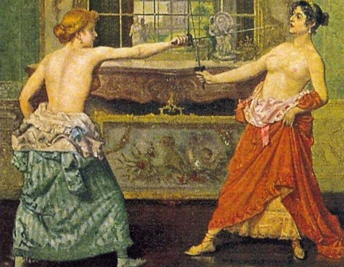 Si ritiene che il primo duello femminile sia avvenuto a Napoli nel 1552 anno. Hanno combattuto con le spade a causa dell’uomo Diambra de Pettinello e Isabella de Carazzi Questa lotta è presumibilmente riflessa in il dipinto “Duello femminile” di Jose de Ribera (Spagna).
