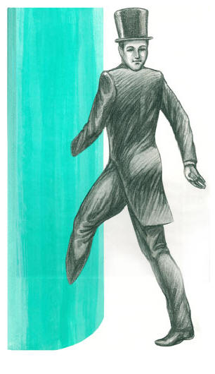 Si udì un rombo di voci, ma era impossibile distinguere le parole … ma improvvisamente tutti improvvisamente saltarono su e si affrettarono a correre. Possibile motivo la paura era l’apparizione di visitatori abituali: dalla colonna di luce ne uscì un uomo vestito con un soprabito nero, una camicia bianca, sul collo c’era una farfalla nera e sulla testa un cilindro dello stesso colore. Viso e le mani, come il primo soggetto in un maglione marrone, erano bianche colori, assolutamente bianchi, come se fossero senza sangue.