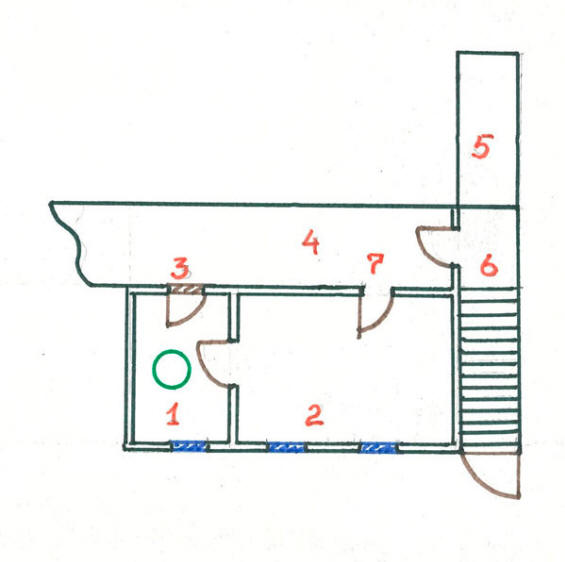 Lo schema generale del seminterrato della casa. 1. La stanza in cui si apriva il portale; 2.Laboratorio di sala comunicante; 3. Una porta inchiodata che si affaccia corridoio comune; 4. Il corridoio comune del seminterrato, che corre lungo l’intera lunghezza a casa; 5. Underground N.V. Streltsova, dove fu trovata l’arma; 6.Scale giù dal lato della strada e lo “spogliatoio” del corridoio del seminterrato; 7. Ingresso all’officina dal corridoio del seminterrato.