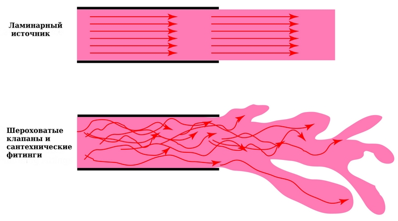 Nel flusso laminare, il fluido si muove a strati, non mescolando e non pulsando, cioè senza improvvisi cambiamenti di pressione e velocità. Per renderlo così “fantastico” dal primo vista flusso, è necessaria acqua molto pulita, il tubo con un liscio superficie interna e, naturalmente, mancanza di vento. Se tutto le condizioni sono soddisfatte, il getto d’acqua sembrerà congelato, cioè statico, anche se in realtà si muove uniformemente a strati.