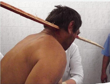 Medici del Dipartimento di Chirurgia orale e maxillofacciale dell’ospedale Maykop quello che vide all’inizio era senza parole: la testa dell’uomo era completamente a posto perforato da un binario di legno!