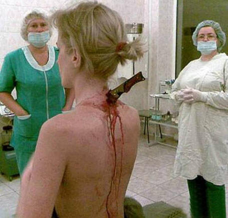Questa foto di una 22enne attaccata Julia Popova un rapinatore vicino a una stazione della metropolitana di Mosca nel febbraio 2010, molti gli esperti prima hanno chiamato falso, perché, secondo loro, una donna ferita in questo modo non poteva sopravvivere. tuttavia I giornalisti britannici sono riusciti a contattare i medici di Mosca ospedali dove è stata operata la ragazza e hanno confermato l’autenticità dell’immagine.