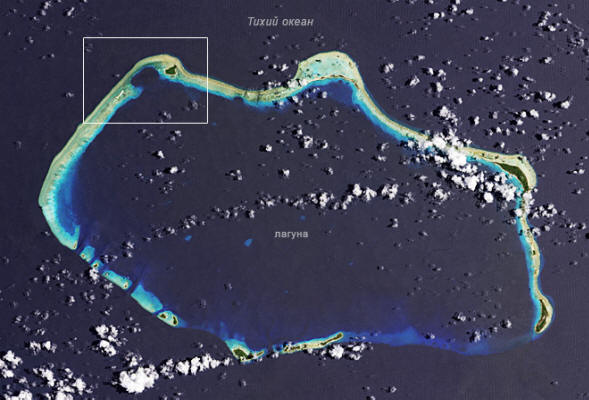 Bikini Atoll, 19 agosto 2013. © NASA Dopo un’esplosione nel terreno l’atollo e le aree adiacenti del fondo marino apparivano come un imbuto di diametro circa 1,8 chilometri. Riempita d’acqua, è cambiata molto Contorni dell’atollo Bikini.
