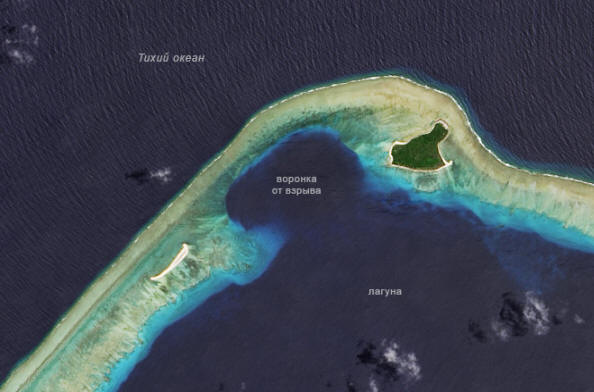 L’imbuto di un’esplosione nucleare. © NASA satellite del 19 agosto 2013 Landsat 8 ha fatto una foto all’atollo. Dimensioni imbuto attualmente sono larghi due chilometri e profondi 80 metri. “Castle Bravo “(quello era il nome di questa operazione) divenne il più potente di tutti i test nucleari statunitensi. Come risultato di radiazioni gravi contaminazione ambientale le opinioni sulle armi nucleari erano rivisto.