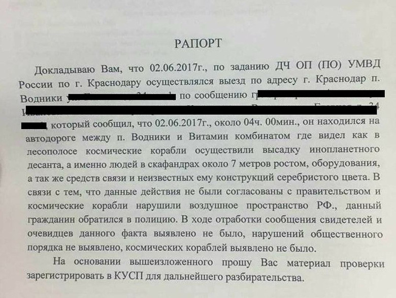 L’uomo era così sorpreso e perfino spaventato da quello che era successo Ho chiamato la polizia e segnalato questo fatto fantastico. anziano il dipartimento di polizia locale del distretto di Prikubansky è andato a la scena dell’incidente, tuttavia, il sito ha esaminato attentamente la situazione nessun alieno o traccia di atterraggio di una nave aliena non trovato. Nonostante ciò, un residente di Vodnikov continua sostengo di aver visto tutto con i miei occhi. alieni Erano in grande crescita, da qualche parte sotto i sette metri, vestiti di alcuni fantastiche tute spaziali, e ce n’erano esattamente sette. Sfortunatamente, a in quel momento non c’era testimone con lui di un telefono cellulare con una macchina fotografica, sì lui e non sarebbe stato in grado di rimuovere nulla: era così colpito da ciò che era andato, e poi, per qualche motivo, era molto spaventato (apparentemente gli alieni lo hanno ispirato paura) che ha cercato di uscire rapidamente dalla scena.