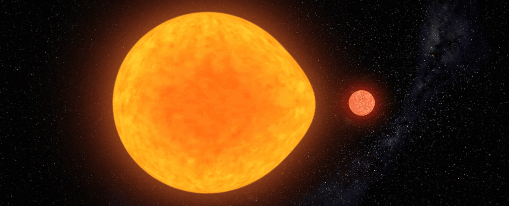 Beh, ha un'amica. Un caro amico. La doppia compagna della stella pulsante è una nana rossa ed entrambe sono in orbita super rigida. In questa prossimità, la gravità della nana rossa distorce HD74423, estraendola a forma di uovo o gocciolina.