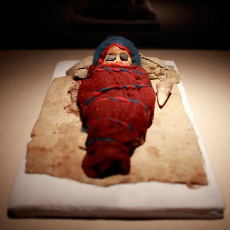 Cosa rende speciali le mummie Cherchen? Prima di tutto, lo sono tutti Caucasoidi alti non meno di 180 cm, non si sa come siano finiti questi posti. Questo è un “uomo cherchen”, tre donne e disteso il cuscino di una pecora bianca avvolto da un bambino di tre mesi materia marrone fine e legata con rosso e blu corde. Il bambino fu sepolto con una bottiglia di corno di mucca e probabilmente con il più antico della storia del ciuccio fatto di pecore mammella; gli occhi del bambino sono pietre blu. La mascella dell’uomo è pulita legato, quindi sembra abbastanza normale, giarrettiera allo stesso modo le teste delle donne si indebolirono e i loro volti diventarono “cantanti” o “Gridare”. Un uomo riposa nella posa di un uomo addormentato su un’amaca, quindi – tenendo conto della sicurezza del corpo – i visitatori del museo involontariamente parlano in un sussurro, come se avessero paura di svegliare l’uomo addormentato.