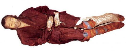 Un abito ben conservato intrecciato con un’imbracatura a treccia e luminoso calze dipinte fatte di filato di pecora. Sul piede sinistro: alto amico di pelle. “Cherchen man” di fronte. Leggermente riccio i capelli castani sono intrecciati in due trecce che scendono sulle spalle – di due, e non da tre, come una volta avevano i cinesi, fili. Capelli grigio chiaro mostra che il defunto aveva più di 50 anni. Si distingue per un invidiabile – sotto due metri – grande e insolito per gli asiatici grande, eccezionale sul viso con il naso. Dalla somma dei segni esterni, l’uomo Cherchen – Indo-europea.