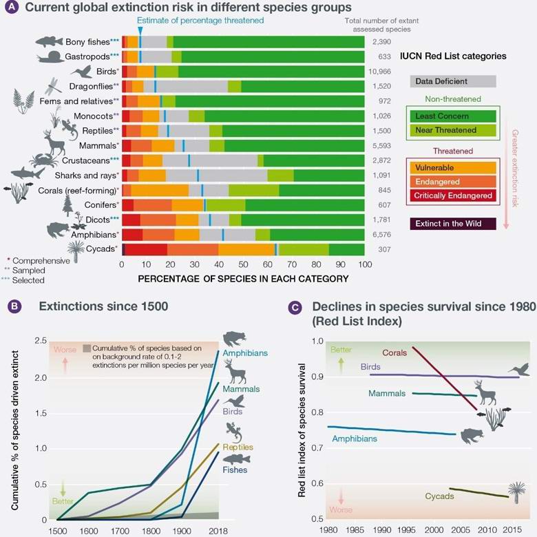 Gli esperti stimano che circa il 75% della terra, il 40% degli oceani del mondo e il 50% dei fiumi e dei laghi ha già subito un certo grado di degrado per colpa della nostra civiltà. In via di estinzione sono di più 40% di anfibi, circa il 33% di coralli di barriera e oltre il 35% di marine mammiferi. Tuttavia, non sono ancora disponibili dati precisi sugli insetti alcuni esperti suggeriscono che l’estinzione minaccia almeno il 10% di essi, ad esempio, completa la scomparsa minaccia le api, senza le quali il mondo che ci circonda diventerà non solo più poveri, ma anche meno generosi con noi in termini di cibo.
