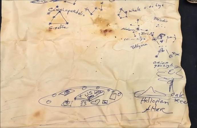 E infine, i cercatori di tesori ne hanno rimosso una grande un pezzo di carta su cui è stata rappresentata manualmente la mappa stellare cielo con pianeti, costellazioni e persino un disco volante. A giudicare da a tutti, l’uomo che ha seppellito questo tesoro era seriamente interessato all’ufologia. Il testo scritto a mano sulla mappa descrive la cronologia del movimento di un certo oggetto volante non identificato.