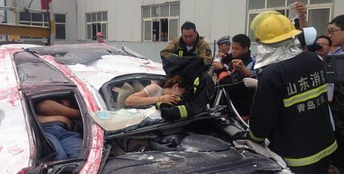 Nella città di Qingdao, situata nella parte orientale della provincia cinese Shandong, si è verificato un terribile incidente stradale. Un camionista che trasporta un container pesante con carico no ha perso il controllo, la macchina si è capovolta e la multi-tonnellata una scatola di metallo è crollata proprio mentre passava un’autovettura nelle vicinanze.