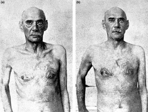 Il primo caso si riferisce a un lavoratore di 44 anni, ma con tutti segni di vecchiaia prematura. È venuto dal dottore per via del generale debolezza del corpo e dolore in entrambi i testicoli. Molto magro, debole, svogliato muscoli, faccia a pieghe.