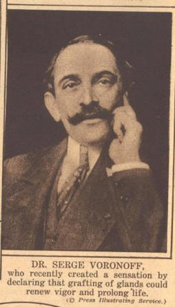 Dal 1920 Voronov iniziò a specializzarsi nel trapianto di testicoli. Ha fatto sottili sezioni sui testicoli dello scimpanzé e li ha suturati nello scroto il paziente. Nella prima operazione, il corpo umano ha preso corpo estraneo. È cresciuto nei testicoli di un paziente di 65 anni. “Questo notevolmente rinfrescato, rughe sul viso levigate, con movimenti apparvero plastica ed energia “, ha descritto Voronov.
