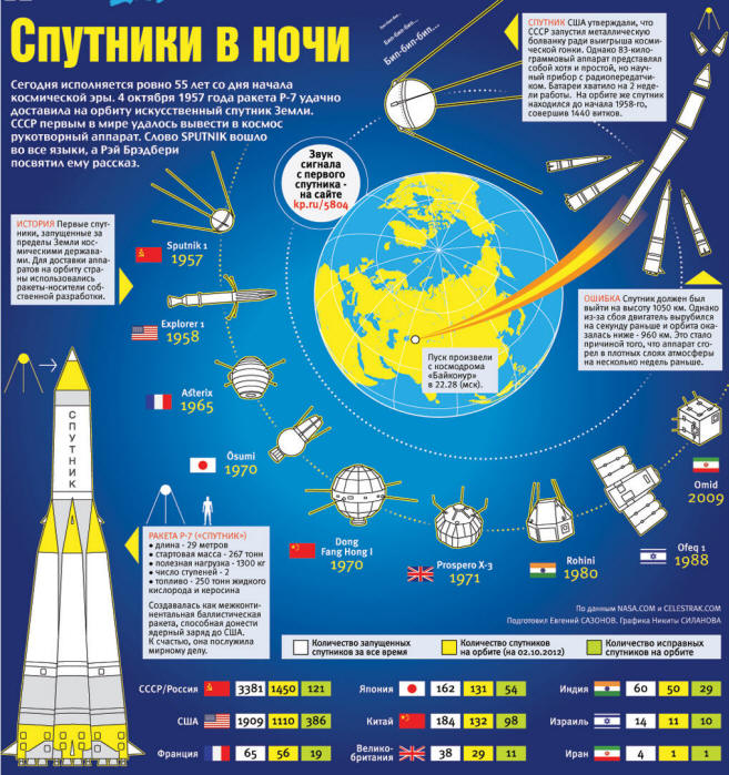 foto da fonti aperte Oggi il mondo intero segna l’inizio dello spazio epoca. Esattamente 55 anni fa, il razzo R-7 fu lanciato da Baikonur con il primo satellite terrestre artificiale a bordo. I preparativi per il lancio erano in corso. in un tempo estremamente breve. Sergey Korolev ha persino spostato la data di inizio a un paio di giorni in anticipo per anticipare gli Stati Uniti con una garanzia. – In servizio i vigili del fuoco accettano la preparazione numero uno. Ignition. Preliminare. La cosa principale L’ascesa. Anno 1957. Si svolge a Mosca Festival internazionale di giovani e studenti che provano Krusciov caccia il segretario generale e John Lennon incontra Paul McCartney. L’Unione Sovietica inizia l’era spaziale lanciando il primo satellite artificiale della Terra. “Trasmettiamo un importante messaggio TASS. 4 Nell’ottobre del 1957, fu lanciato con successo in Unione Sovietica il primo satellite terrestre artificiale del mondo “, – in queste parole il giovane presentatore della radio e televisione di stato Igor ha salutato il pubblico Kirillov. È stata la prima vittoria nello scontro tra due spazi poteri. È iniziato nel 1955 quando il presidente degli Stati Uniti Dwight Eisenhower ha dichiarato: “Dopo 2 anni, gli Stati Uniti lanceranno il primo luna artificiale. “Così gli americani chiamarono il loro satellite. Messaggio dall’estero percepito come una sfida. La risposta immediatamente seguì: proprio lì ha approvato una commissione speciale per lo sviluppo del programma sovietico satellite artificiale della Terra.
