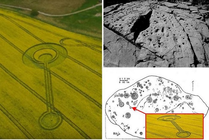 È interessante notare che un simile disegno fu ritrovato nel 1887 su una pietra di Kokno di 5000 anni fa nella regione scozzese del Dunbartonshire occidentale. L’archeologo britannico James Harvey scoprì poi nella fattoria locale una lastra di pietra incomprensibile che misura circa 9 per 18 metri, su quali infinite linee, punti, spirali, cerchi e altre forme geometriche. Dopo aver studiato attentamente la scoperta, lo scienziato suggerì che il manufatto raffigura una mappa del cielo stellato. e uno dei simboli indicati sulla pietra di Kocno corrisponde esattamente al un geoglifo trovato due settimane fa in un campo inglese.
