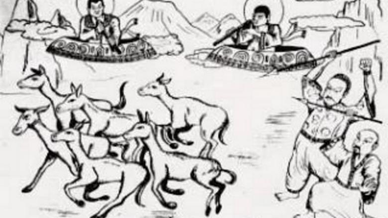 Presta attenzione alla riproduzione artistica di one and petroglifi scoperti in Giappone sull’isola di Joto nel 1957. Questo dipinto rupestre è stato trovato in un labirinto di montagna.