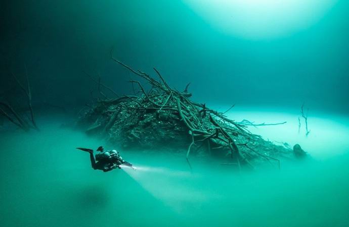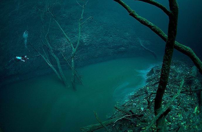 Due decine di chilometri dalla città messicana di Tulum in poi nella penisola dello Yucatan puoi trovare un posto unico che è culto per sub esperti. Potresti pensarlo qui il paesaggio sottomarino circondato da un alone di misticismo è stato preso da il sogno sbalorditivo di qualcuno, o addirittura da un altro pianeta. su a una profondità di diversi metri scorre un fiume luminoso, ai cui lati come se crescessero alberi veri.