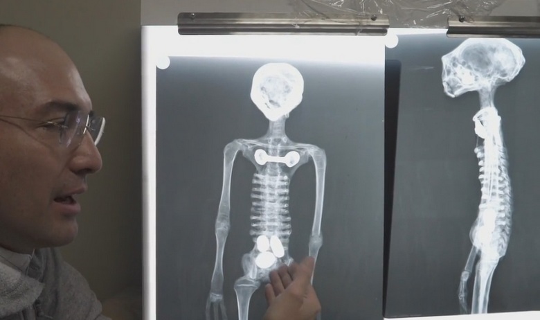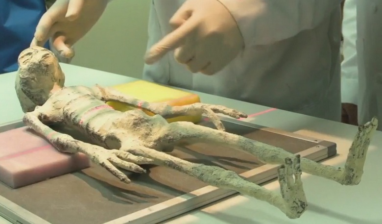 Mario è stato davvero fortunato e ha trovato una grotta in cui c’erano due sarcofagi. In uno, sono stati memorizzati vari oggetti, circa di cui il ricercatore non si è ancora diffuso, e nelle altre due mummie di medie dimensioni e alcune piccole. La più grande mummia l’alieno, che per la prima volta fu introdotto da lui alla corte degli scienziati, era fuori dal sarcofago, lei giaceva lì vicino in qualche strano polvere bianca.