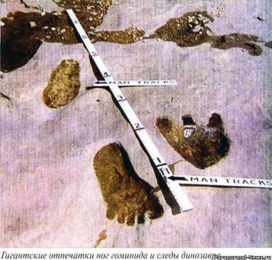Il sentiero conduce in Turkmenistan, tra le montagne del Kugitang-Tau chiamato anche Altopiano dei dinosauri, furono scoperte tracce dell’uomo e dinosauro – nel 1983, secondo il quotidiano di Mosca notizie “(n. 24) con riferimento al direttore del museo paleontologico Turkmenistan. La notizia è quindi suonata nel programma “Time”. Uno di il primo ha registrato diverse impronte umane pietrificate tra lo scienziato Kurbon Amanniyazov di molte impronte di dinosauro. umano le impronte sono nettamente diverse da quelle lasciate dalle zampe tridattili dinosauri. La pista è oblunga, il tallone è visibile. Lunghezza libera la stampa era di 26 cm, che corrisponde alla 43a misura di scarpe uomo moderno. In totale, sono state trovate sei tracce del genere. loro l’età è determinata nell’intervallo 150-200 milioni di anni.