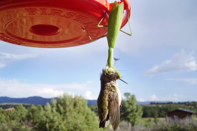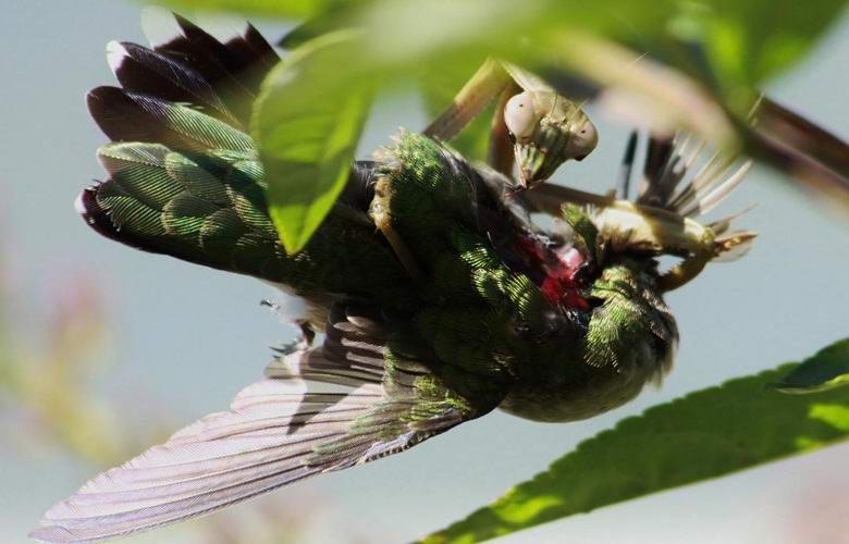 Si è scoperto che non solo i colibrì diventano vittime della mantide, ma anche alcuni rappresentanti particolarmente piccoli dei distacchi passeriformi e turni. I mantoptera preferiscono mangiare spostamento di prede dal vivo – forse è per questo che dimensioni modeste uccelli e attirare questi insetti. Mantis religiosa di solito lo è si insinua impercettibilmente fino all’uccello dall’alto, pende e afferra la vittima con le zampe a spillo dietro la testa, dopo di che scava fa mascelle negli occhi e divora il cervello. Un’altra trama per il momento film horror.