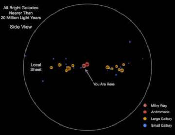 Foto da fonti aperte Più vicine alla nostra galassia 20 milioni gli anni luce contengono una serie di galassie luminose che formano un anello il centro del quale puoi vedere la Via Lattea. (Qui e sotto illustrazioni di Marshall McCall / Università di York.) Astronomo Marshall McCall (Marshall McCall) dell’Università di York (Canada) ha cercato di colmare questa lacuna. Tutto è risolto nel suo lavoro galassie luminose che distano fino a 35 milioni di anni luce da noi. “Tutto galassie luminose in un raggio di 20 milioni di anni luce, compresa la nostra, organizzato nella “Foglia locale”, con un diametro di 34 milioni di luce anni e uno spessore di soli 1,5 milioni di anni luce, afferma McCall. – La Via Lattea e la Nebulosa Andromeda sono circondate da 12 grandi circa 24 milioni di galassie in un anello anni luce. ”12 delle 14 grandi galassie della“ Foglia locale ”, tra cui noi e il nostro vicino più prossimo, siamo a spirale, con appiattiti dischi; c’è ancora formazione stellare qui. I restanti due lo sono galassie ellittiche non appiattite la cui formazione stellare in il passato. Entrambi si trovano sui lati opposti del suddetto. “Squilla”, che McCall chiama scherzosamente il “Consiglio dei Giganti”. Come suggerisce lo scienziato, il materiale buttato via da questi strutture, potrebbero alimentare a tempo debito “gruppo locale”, aiutando creare grandi dischi come quello che ha la Via Lattea e nebulose di Andromeda. Lo stesso anello, vista laterale.