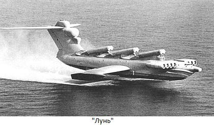 Naturalmente, i militari si interessarono all’idea. Hanno individuato i professionisti fuggito da esperti civili. Volare a bassa quota l’ecranoplano non è visibile ai radar, mentre non ha assolutamente paura mine anti-nave. Nel giugno del 1966 fu lanciato il primo ekranoplan sperimentale. Fino all’avvento dell’AN-225 nel 1988, era l’aereo più pesante del mondo. Nei documenti KB ekranoplan passò come “KM” (nave finta), gli americani decifrò l’abbreviazione a modo suo: “mostro caspico”. “Lun” e “Eaglet” Nel 1983, sulla base di “KM”, iniziò la costruzione (e in 1986 finito) del lanciarazzi sovietico Lun, progettato per distruggere le portaerei. Sorvolando la maggior parte con acqua (dai 4 ai 14 metri) era invisibile ai radar e poteva salire distanza di lancio del missile (armamento – supersonico alato razzi “Mosquito”, 6 pezzi). Lo ha reso ad alta velocità (fino a 500 km / h) invulnerabile ai missili militari delle navi da guardia, il Lun con facilit� si allontanò dalla persecuzione, era impossibile lasciarlo (velocit� Trasportatore nucleare statunitense – 70 km / h.) Carico di combattimento – 140 tonnellate, autonomia di crociera – 2.000 km. Gli americani lo hanno definito un “assassino” portaerei “.