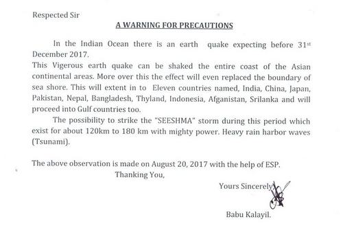 Una previsione del futuro al di fuori della scienza è un gruppo di sensitivi indiani e gli scienziati, tra cui Babu Kalayil, non sono per lo più coinvolti, tuttavia, vedendo il disastro imminente, beh, semplicemente terribile Oceano Indiano, Babu Kalalaal semplicemente non poteva tacere, anche se non lo fece Sono sicuro che il suo avvertimento sarà ascoltato e le persone (in particolare, i governi di questi paesi) potranno fare qualcosa per per evitare che il disastro si avvicini a loro.