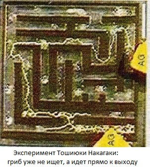 Il biologo giapponese ha ammuffito all’ingresso di un piccolo labirinto fungo e all’uscita – un pezzo di zucchero. In cerca di cibo, il fungo rilasciato filetto. “Sentendo” con loro ogni angolo del labirinto, i funghi la sera arrivato al dolce. Quindi il germoglio del fungo fu deposto all’ingresso di tale lo stesso labirinto. Il fungo non ha iniziato a studiare l’intero labirinto, ma è stato rilasciato un filo e la via più breve andarono dritti al punto in cui stava aspettando “Dessert”.
