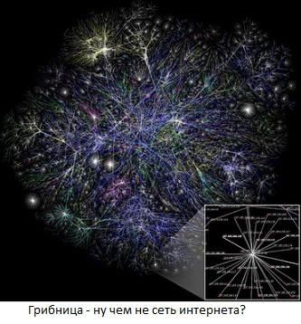 Se prendiamo in considerazione il fatto già dimostrato che l’individuo parti del micelio sono quindi in grado di scambiarsi informazioni tra loro il micelio può essere confrontato con Internet, dove ogni singolo PC collegati da fili di informazione con milioni di persone del loro genere. solo se il World Wide Web è sotto il controllo umano, allora? un solo micelio sta tramando – solo a Dio è noto