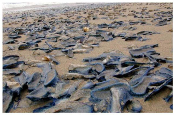 Milioni di creature simili a miele gettate sulla costa California. Il nome di questo parente di meduse è Velella Velella, le creature vivono sulla superficie dell’acqua e viaggiano grazie ai venti.