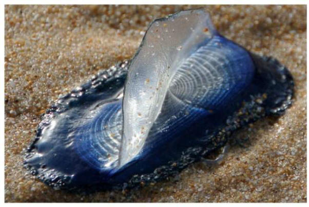 Secondo il nome, Velella ha una specie di vela, attaccato alla loro testa. Quella “vela” permette loro di impegnarsi navigare come desideri. Sono cacciati da pochi predatori, sebbene alcune lumache marine e le lumache acquatiche si nutrano di loro.
