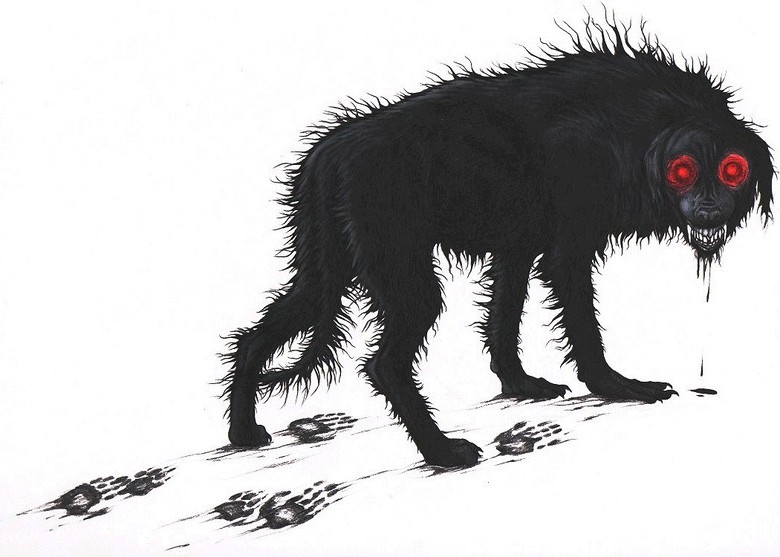 Va detto che le descrizioni dei cani neri sono leggermente diverse, ma tutte le fonti testimoniano che sono innaturalmente enormi taglia, cappotto ispido e grandi occhi ardenti. A volte sul collo i cani potevano vedere una catena, a volte si trattava solo di creature inquietanti corpo del cane nero e volto umano. Sono stati menzionati i cani che vivono nella nebbia e i cani che camminano sulle zampe posteriori, infine, cani delle dimensioni di un’intera casa …