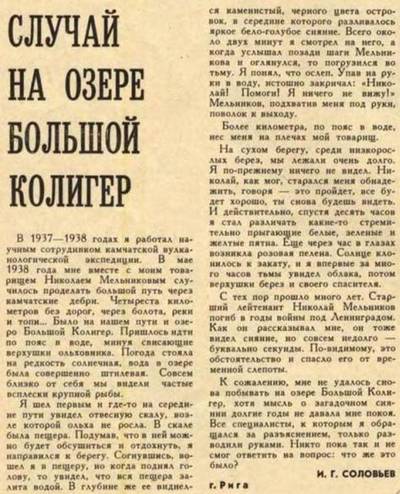 Nel 1938, un geologo fece un viaggio nel misterioso lago e Vulcanologo Igor Soloviev. Aveva un partner in assistenti Nikolai Melnikov. I ricercatori non hanno trovato percorsi vicino al lago, persino animali, e quindi dovevano percorrere la costa via acqua. È positivo che fosse la fine di maggio e che l’acqua nel lago fosse già riscaldata.