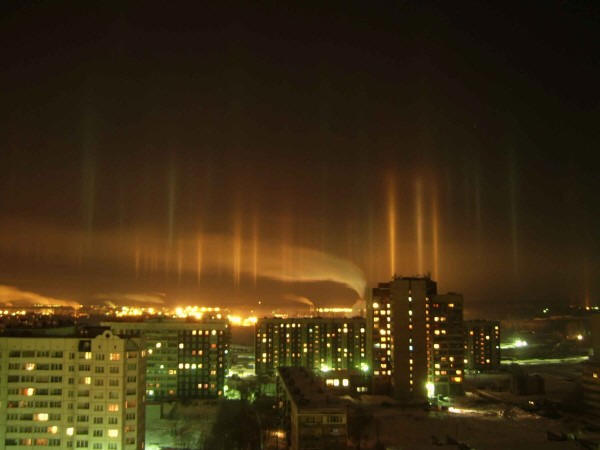 Spesso, gli aghi di ghiaccio formano una bella luminosità di notte “pilastri” che vanno dalle lanterne verso l’alto nel cielo.