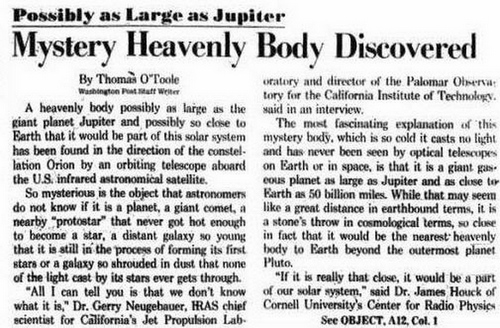 30 dicembre 1983 sulle pagine del giornale Washington Post c’era una nota su un misterioso corpo celeste che si muoveva lato del nostro sistema solare. L’articolo diceva che il suo scoperto un telescopio nello spettro infrarosso (un oggetto molto scuro) Satellite IRAS e finora questo corpo è a 50 miliardi di miglia da Del sole.