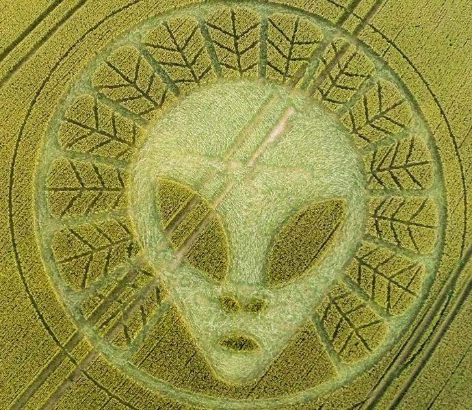 Quando i cerchi nel grano sono solo linee, anelli e le figure geometriche più semplici sono talvolta accusate del loro aspetto lampi di palla e micro tornado, tuttavia, in questo caso, qualsiasi è chiaro che questo è un modello creato dall’uomo e sul grano volevano rappresentare una testa aliena stereotipata. Comunque chi è questo ha fatto: gli alieni stessi o sono persone?