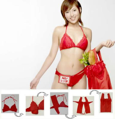 In questa invenzione completamente folle, viene utilizzata la tecnica. origami e furoshiki (Furoshiki, se qualcuno non lo sa – questo è giapponese tappetino da bagno che si trasforma in una borsa multifunzione per vestiti bagnati). La borsa riutilizzabile si trasforma in un set di reggiseno e mutande.